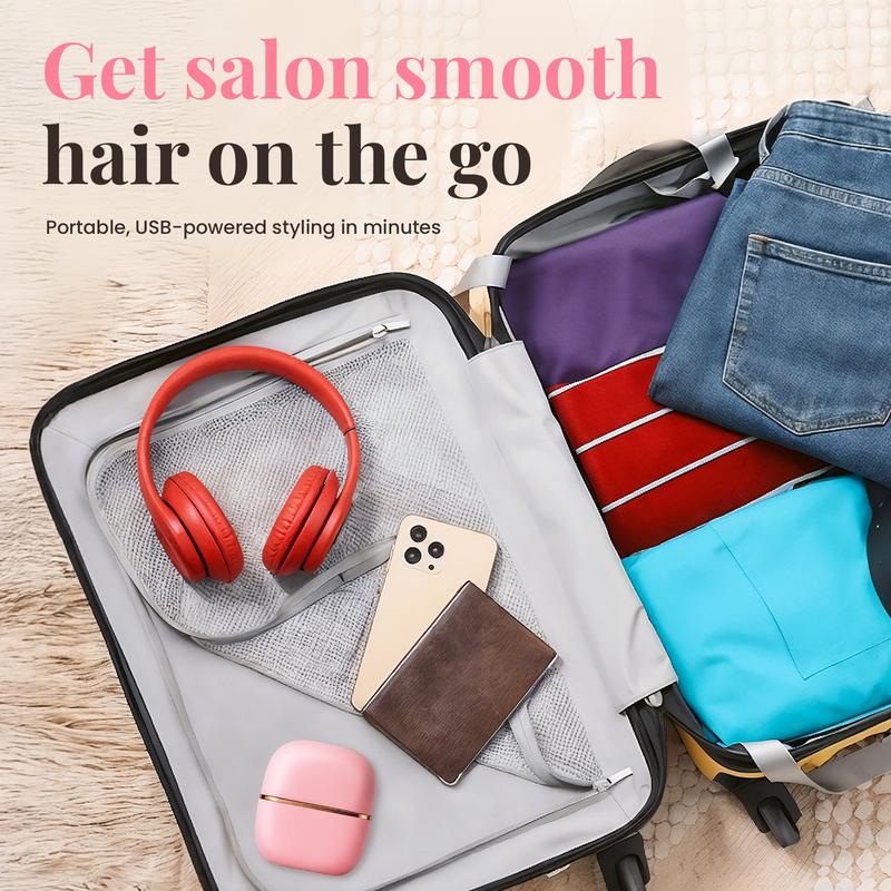 This portable 2-in-1 heated comb & iron is perfect for travel and home use. It's a multifunctional hair styler designed for easy portability. The USB-C rechargeable feature ensures you're always connected. Ideal for quick styling on the go. The Straightener is compact and easy to take anywhere with its petite size of 8.3cm by 3.5cm dimensions